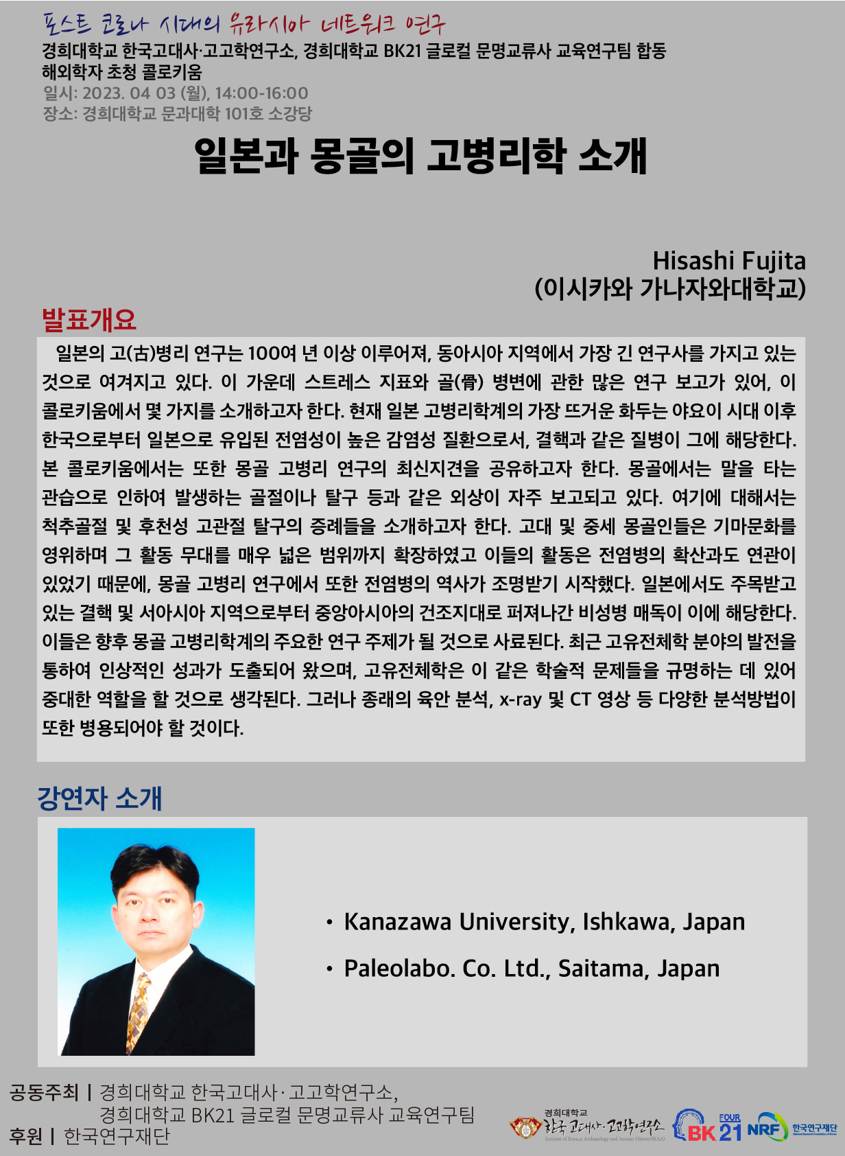 경희대학교 한국고대사·고고학연구소, 경희대학교 BK21 글로컬 문명교류사 교육연구팀 합동 해외학자 초청 콜로키움: 일본과 몽골의 고병리학 소개