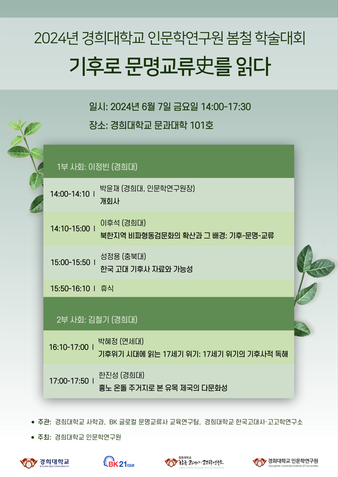 오는 6월 7일 경희대학교 문과대학 101호에서 2024년 경희대학교 인문학연구원 봄철 학술대회 '기후로 문명교류史를 읽다' 가 개최됩니다.