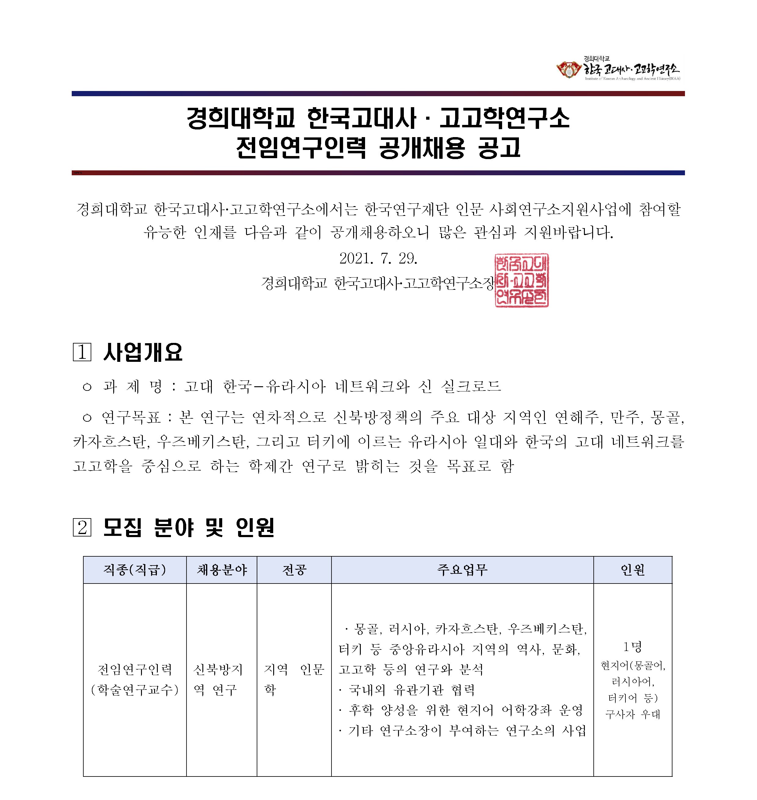 경희대학교 한국고대사·고고학연구소 전임연구인력 공개채용 공고.pdf [1.18MB]