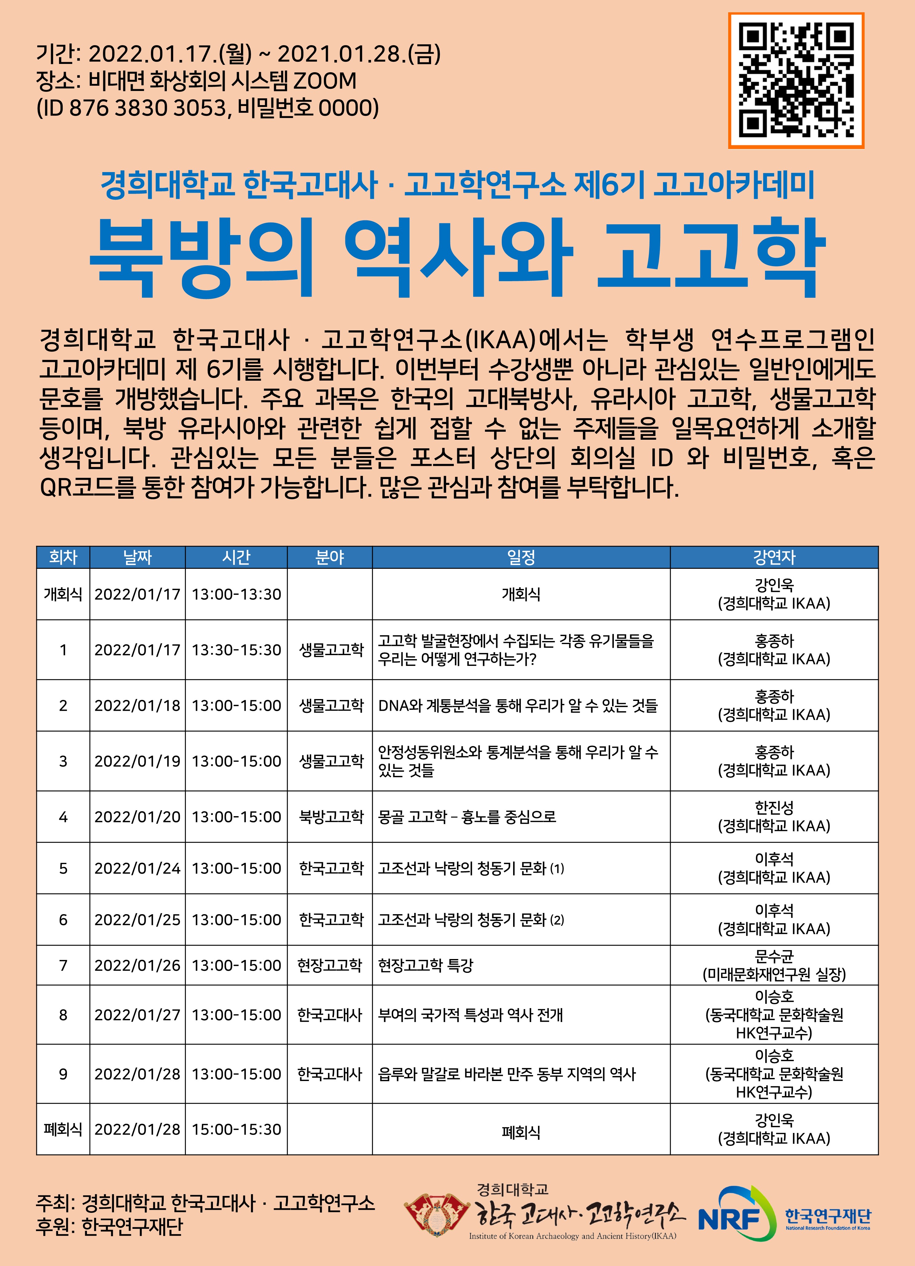 경희대학교 한국고대사 · 고고학연구소(IKAA)에서는 학부생 연수프로그램인 고고아카데미 제 6기를 시행합니다. 이번부터 수강생뿐 아니라 관심있는 일반인에게도 문호를 개방했습니다. 주요 과목은 한국의 고대북방사, 유라시아 고고학, 생물고고학 등이며, 북방 유라시아와 관련한 쉽게 접할 수 없는 주제들을 일목요연하게 소개할 생각입니다. 관심있는 모든 분들은 포스터 상단의 회의실 ID 와 비밀번호, 혹은 QR코드를 통한 참여가 가능합니다. 많은 관심과 참여를 부탁합니다.