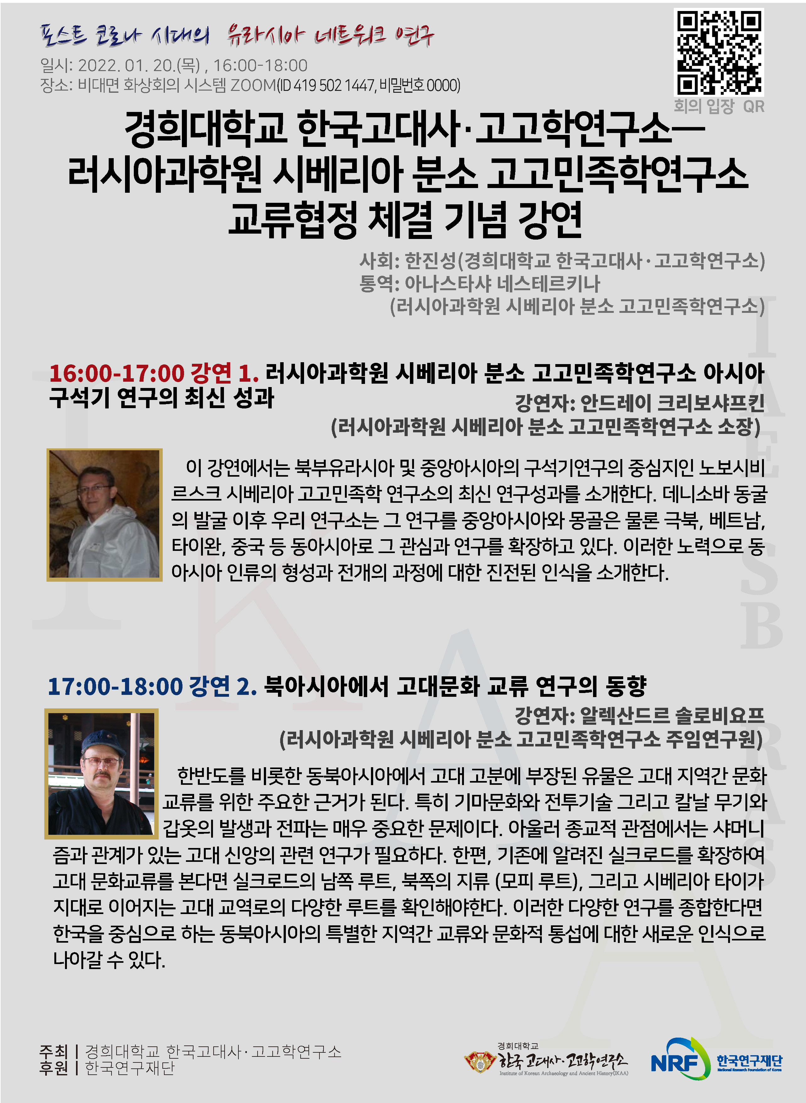 경희대학교 한국고대사·고고학연구소―러시아과학원 시베리아 분소 고고민족학연구소 교류협정 체결 기념 강연을 안내해드립니다.