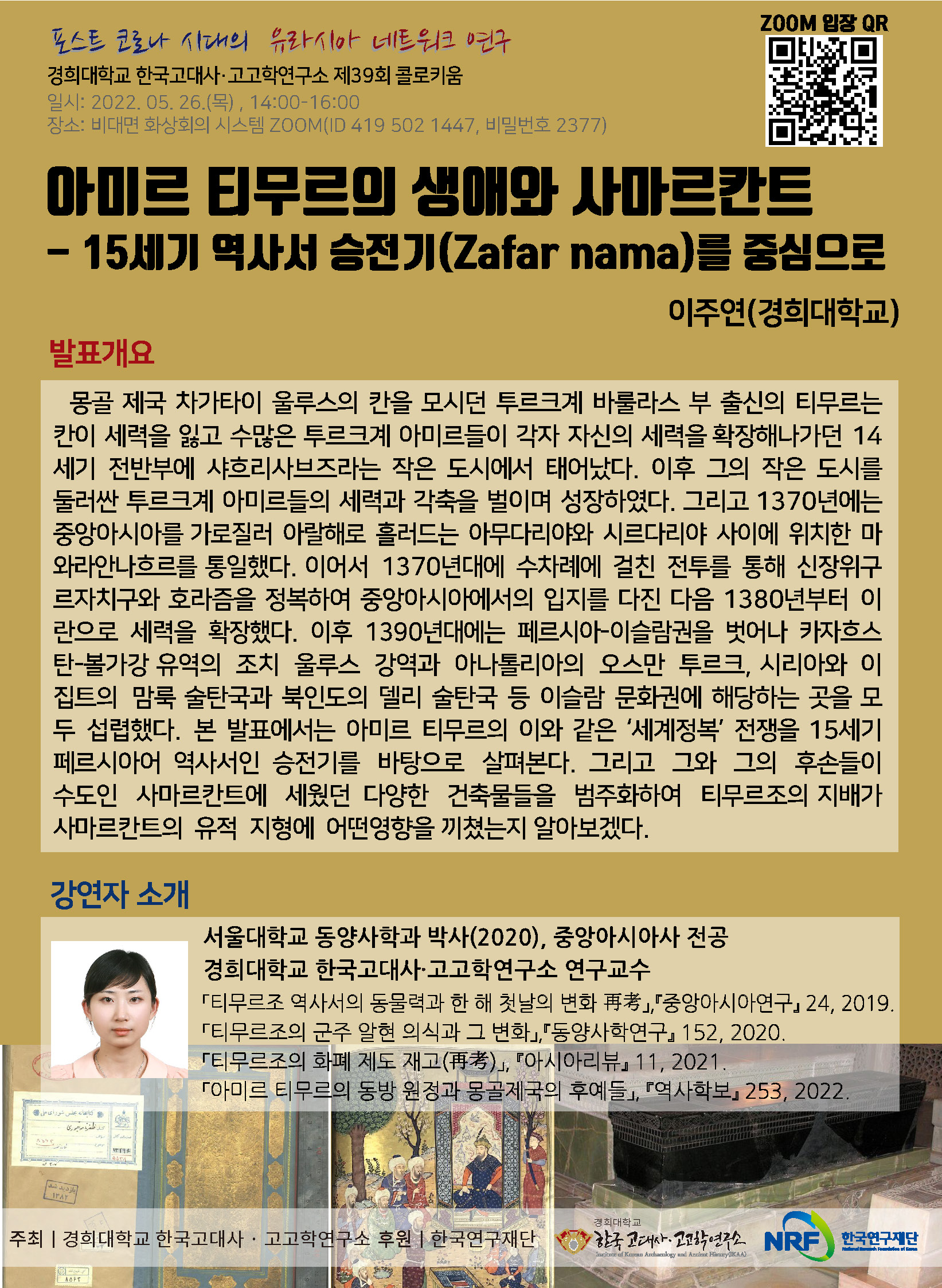 제39회 콜로키움: 아미르 티무르의 생애와 사마르칸트 - 15세기 역사서 승전기(Zafar nama)를 중심으로