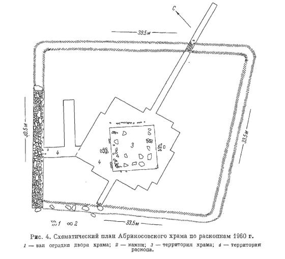 아브리코스의 절터를 발굴한 사람은 발해고고학의 기초를 세운 샤프쿠노프 박사이다. 그는 1930년생으로 세계 2차대전 직후에 레닌그라드 대학을 졸업하고 시베리아 고고학의 아버지인 A.P.오클라드니코프의 밑에서 박사과정을 다니면서 연해주 고고학에 전념하기 위하여 블라디보스톡으로 파견되었다. 아브리코스 유적을 발굴할 때에 샤프쿠노프는 갓 30살로 바로 몇 년 전에 러시아 경내에서는 거의 최초의 불교사원 유적인 발해의 절터인 코프이토 유적을 발굴한 직후여서 발해의 불교에 대한 관심이 높았기 때문이었다. 1960년 여름에 연해주 크로우노프카강(당시는 차피고우강이라고 불리웠다)에서 발해의 절터인 아브리코스 유적을 조사했다. 그리 크지 않은 이 절터(그래서 그는 이 유적을 사원이라는 뜻의 ‘흐람’이라고 적지 않고 그보다 작은 장소인 ‘쿠미르’라고 불렀다.)에서는 예상대로 여러 불상들과 기와들이 출토되었기 때문에, 발해의 절터로 추정한 그의 예상은 잘 들어맞았다. 그런데 발굴 중에 흙덩이 속에서 자칫 그냥 지나칠만할 정도로 작고 네모난 진흙제 유물이 눈에 띄었다. 흙을 털어내자 그 위에 십자가 모습이 새겨진 것이 드러났다(샤프쿠노프 1968 [발해국의 역사와 문화]). 샤프쿠노프는 십자가의 끝이 넓어진 형태에 주목해서 ‘동시리아’식의 네스토리우스교 십자가로 규정했다. 어쩌면 꽃 삽으로 퍼낸 흙 속에서 자취도 없이 사라질 뻔한 이 진흙제 십자가 덕택에 러시아 학계에서는 실크로드의 교류를 대표하는 경교의 흔적이 발해에서도 존재했음이 정설화되었다.